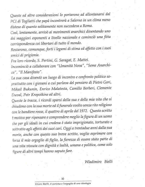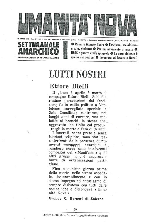 La figura e la storia umana/politica di Ettore Bielli è simile alle migliaia di donne ed uomini che abbracciarono il pensiero e l’agire anarchico tra repressione, persecuzioni ed ostilità non solo del potere capitalista ma anche da parte delle formazioni politiche staliniste.
